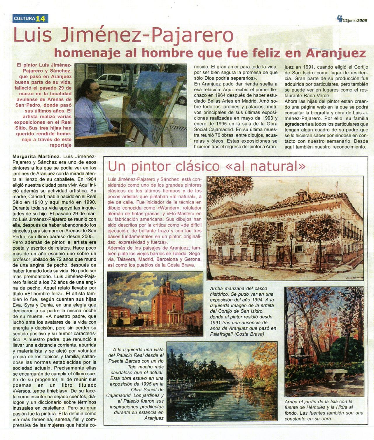 El artista pintor-poeta, Luis Jiménez-Pajarero y Sánchez, que eligió la bella localidad de Aranjuez en 1964 como inicio de su actividad artística, tras estudiar Bellas Artes en Madrid, ha fallecido recientemente, el 29 de marzo de 2008, en Arenas de San Pedro (Ávila), población en la que residía desde 2005 y considerada por él como su último paraíso, entre cuyas gentes había encontrado paz a su alma errante.